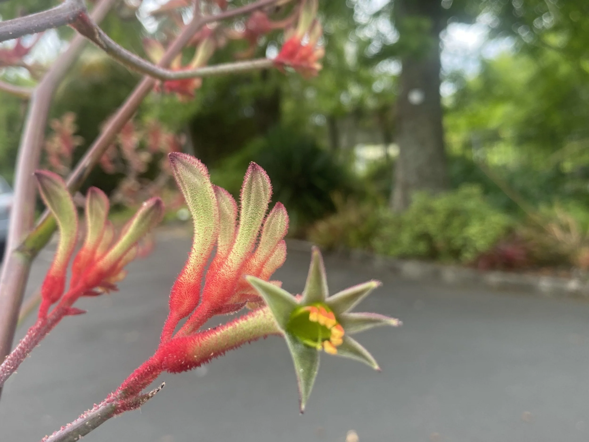 Kangaroo Paw - just so much easier to pronounce and remember! These bizarre looking plants are in full flower on the right hand side of West Lynn Garden car park at present - nodding and bending in the breeze, their tall stems with strange furry fingers on top might brush pass your head on arriving or leaving the car. Be not afraid - they are not dangerous but, in fact quite fascinating. Coloured light pink or red, look closely - you may see the tiny yellow petals of each flower.